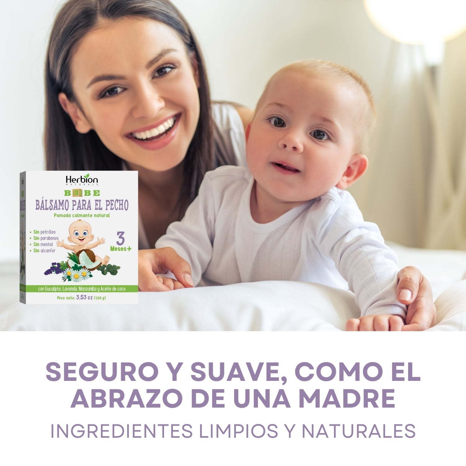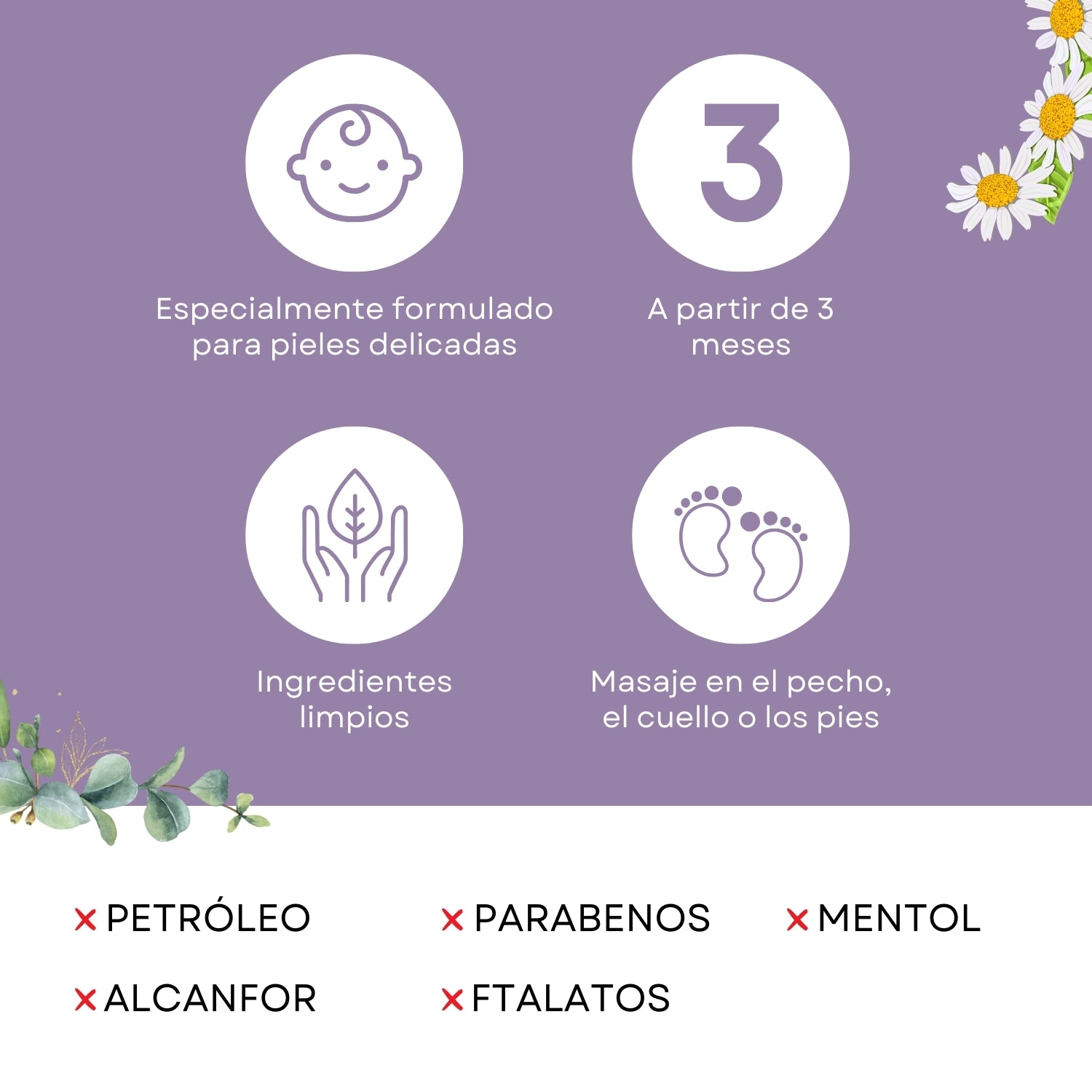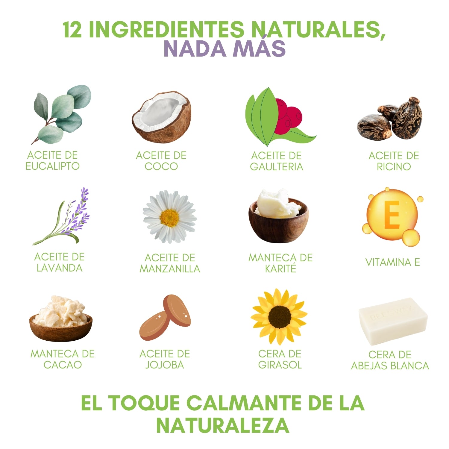 Este producto natural combina aceites esenciales calmantes como el eucalipto y la lavanda con mantecas nutritivas como la de karité y cacao para calmar e hidratar la piel delicada. No contiene productos químicos agresivos y es adecuado para bebés a partir de 3 meses.