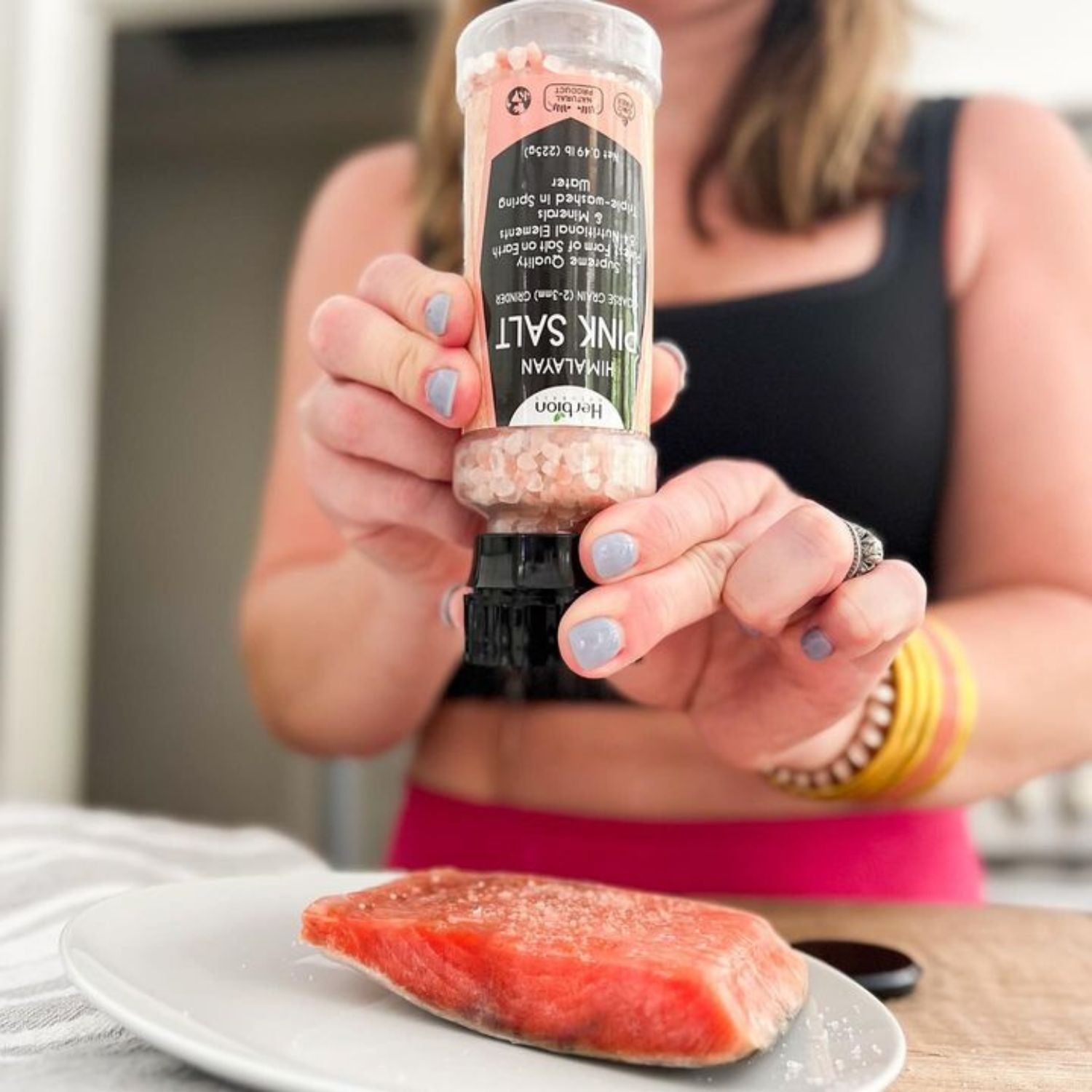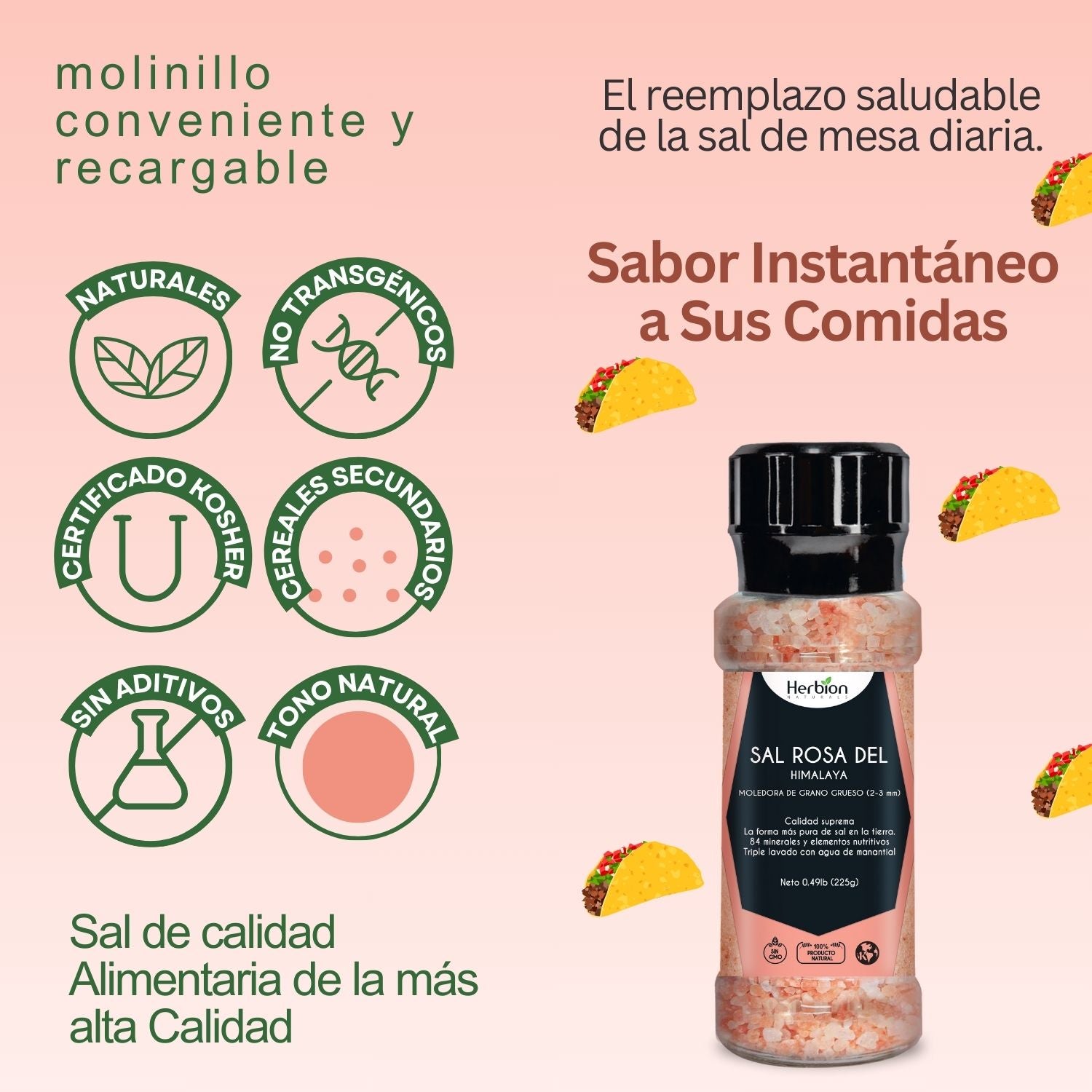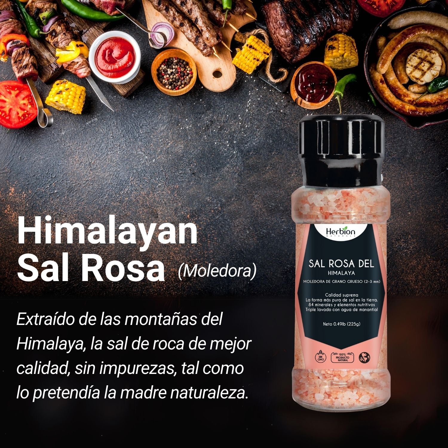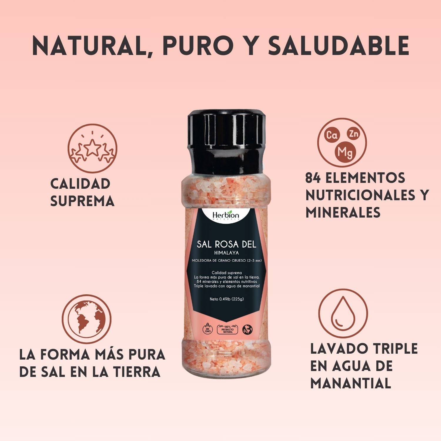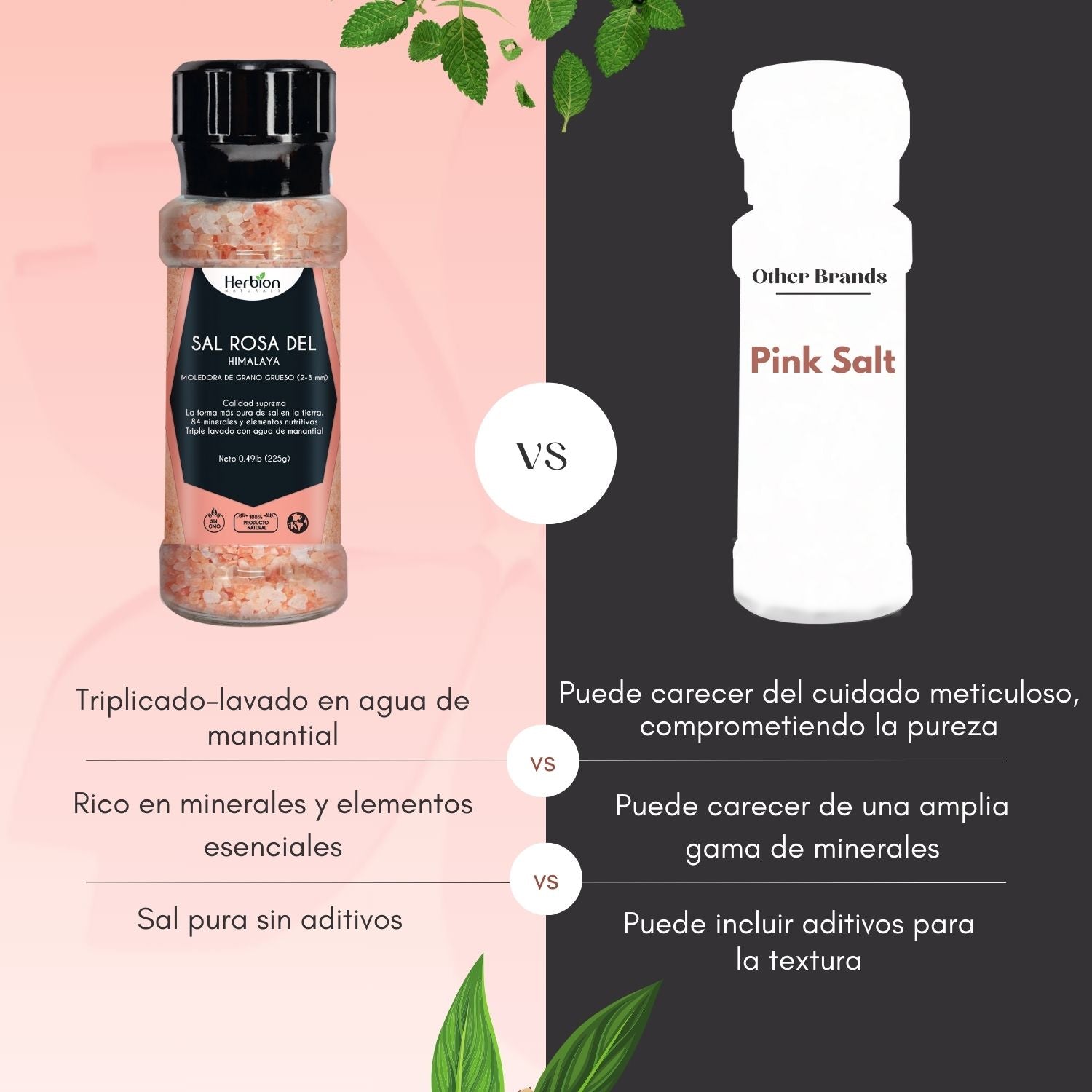 Esta prístina sal gema, extraída del Himalaya, contiene 84 oligoelementos esenciales y un tono rosado natural. La lavamos meticulosamente tres veces en agua de manantial para garantizar su pureza, convirtiéndola en una alternativa deliciosa y saludable a la sal de mesa. Envasada en un práctico molinillo reutilizable, la Sal Rosa Herbion añade un toque de sabor gourmet y un aporte de minerales esenciales a cada plato.